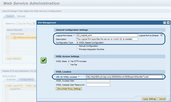 - URL for WSDL Access: https://<SAP Quality Center Server>:8080/EIServer/SMBlueprintHandler?wsdl
