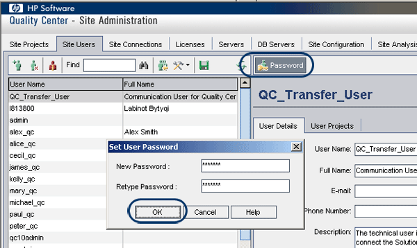 Set the user password for the user name you have just created (QC_Transfer_User in this example) by clicking the Password button (Figure 8).