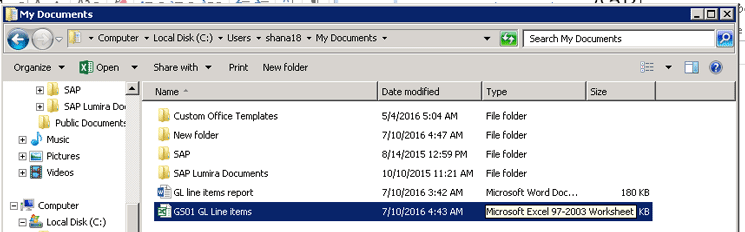 The G/L line item Excel file display