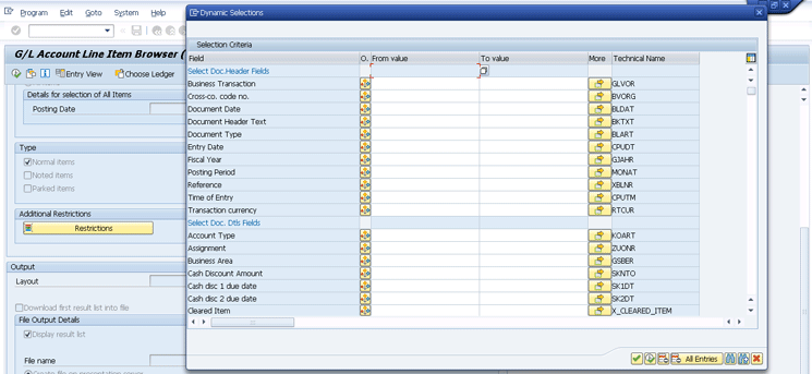 Another additional feature in the new G/L line item browser is additional restrictions. About 340 fields are available to restrict data based on any criteria you can use (as shown in