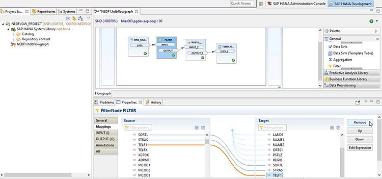 Now that you have the shell and the source for your SAP HANA EIM flowgraph, you have to link all the pieces and complete a meaningful ETL process.