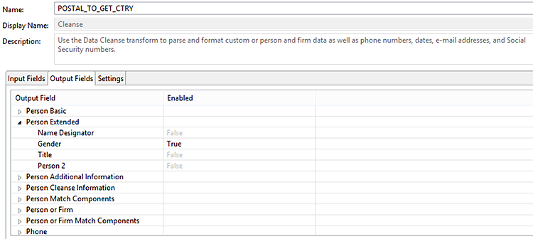 Figures 18 and 19 show the Output Fields subtab of the General tab on the cleanse transformation. Remember, my goal was to get the country of the address and the gender of the person’s name. Figure 18 shows the fields that I want to output to accomplish the first part of this goal, namely the country and the country’s technical code. I set the Enabled column next to the Country Code, Country, and Postcode rows to True to have the cleanse transform output these fields.