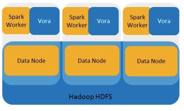 SAP HANA Vora runs as one service on the platform. The SAP HANA Vora instance holds data in memory and boosts the performance of Apache Spark. This instance contains the SAP HANA Vora engine and Spark Worker, both installed on the nodes that hold the data for processing (called data nodes in the cluster). SAP HANA Vora interacts with the Spark in-memory data-processing engine to improve performance. SAP HANA Vora enables the analytical process of Hadoop, and enables hierarchy reporting by allowing hierarchies to be built on top of the Big Data.