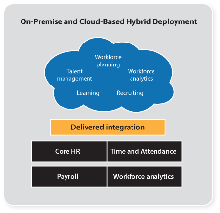 This type of deployment – a mixture of on-premise and cloud – is referred to as hybrid deployment. Usually, in this kind of deployment, the core HR modules (such as Organizational Management and Personnel Administration) are on-premise with the other modules being in the cloud (Figure 2).