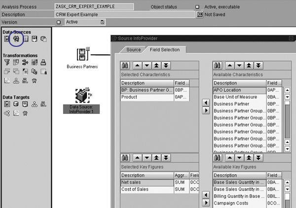 Step 1. Choose an InfoProvider. Select an InfoProvider from the data source by clicking on the InfoProvider icon circled in Figure 10. InfoProviders in BW contain characteristics and key figures such as the sales per customer in a specific region. I chose the 0CSAL_C02 (sales planning) InfoProvider from the standard BW content in the Source tab in Figure 10. It contains structures for storing sales information about customers or business partners.