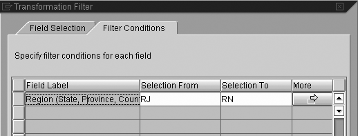 on the right side of the business partners icon and move the mouse to the filter 1 icon to connect them. This sends the data from the data source through a filter and allows further transformation. You can configure the filter by double-clicking on the filter 1 icon, which brings up the Transformation Filter screen (Figure 4). Here you choose the business partner’s attributes you want the system to filter. In the Filter Conditions tab, you can define the values that are allowed for this attribute by selecting one or several of the Available Fields. For example, if you want to address business partners in Rio de Janeiro, you would create the filter shown in Figure 5.