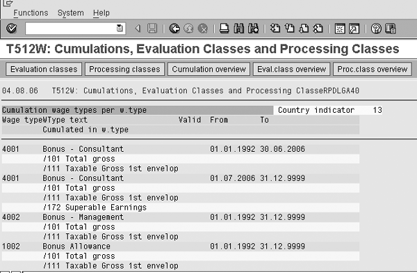 After executing the report from Figure 9, you can see the cumulation overview in Figure 10. This screen shows the cumulations against which each of the wage types are attached. It is very useful to notice if some wage types are delimited as these dates do not appear for the evaluation and processing classes.