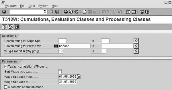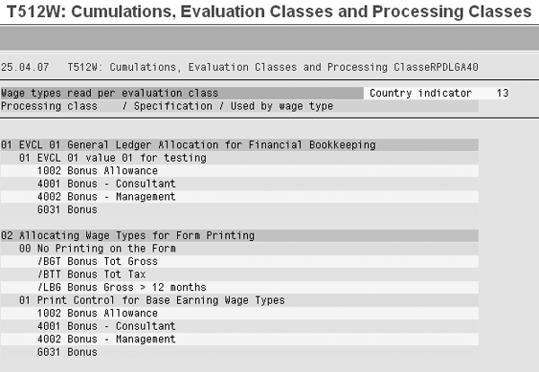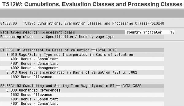 Report RPDLGA40 (T512W Cumulations, Evaluation Classes, and Processing Classes) shows you the specifications for each processing class. It reports on the same characteristics as the above report. However, because of the way the output is displayed, it is easier to compare wage types. This report is best to use when you are comparing a number of wage types to see why they are behaving differently in payroll. Until I was aware of this report, I would compare screen dumps of table V_T512W_O.