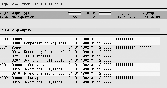 As with the above reports, you can select wage types using the wage type code or text and the country grouping. You can sort the results according to the Wage type text (T), Wage type code (L), Start Date (B), or End Date (E) of the wage type. Each wage type has a four-character code, 4002 for example. The wage type text held in table T512T is a description of this code Bonus – Management. The configuration of wage types attributes (such as processing, evaluation classes, cumulations, and mappings to groups of employees and personnel areas) can change over time. These attributes can be valid from specific dates. The start date is the beginning of the validity period and the end date is the end of this validity period.