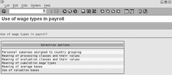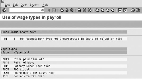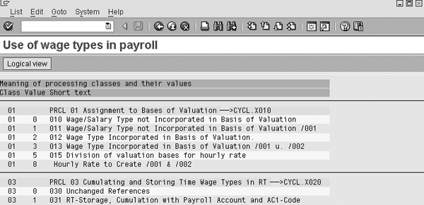 Figure 3 is the output when you choose processing classes. Double-click on the processing class specification (any line under the highlighted processing class name) for results of all wage types with that specification. In this instance, you are examining all wage types with a particular processing specification. For example, if I click on the line with value 3, I will see all wage types that make up my valuation bases 01 and 02. When you double-click on a specification from Figure 3, you see the screen in Figure 4. This screen shows all wage types with the processing class set to specification 1.
