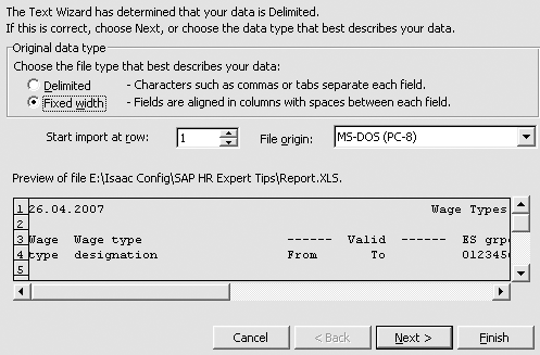 From Excel, open the file. If you open a text document from Excel, the import wizard appears (Figure 3). In step 1, select Fixed width and click on the Next button. The fixed width setting allows users to determine where column breaks should occur. In this example, I have left the automatic mode on and you can see the infotypes for each wage type.