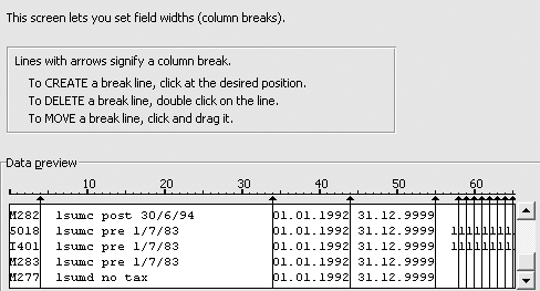 In step 2, place lines at columns 4, 34, 44, 55, 58 to 67, and 69 to 79 (Figure 4). Select Finish. These lines mark the beginning and end of important information. Wage type code finishes at column 4, text at 34, start date at 44, and so on.