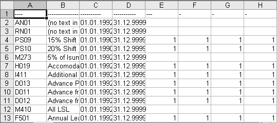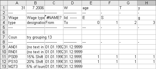 Figure 2 shows the output when you execute report RPDLGA20 in table structure. In this screen, double-click on the attribute you are interested in for further analysis. Lists of different specifications are behind each attribute that you can assign to individual wage types.