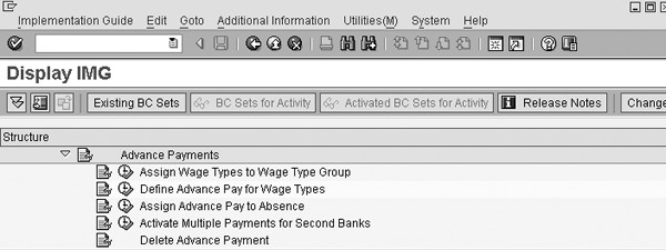 To display the IMG steps to configure the characteristic of the wage type that the cursor is on, click on the Logical view button shown in Figure 3. Double-click on the IMG access line labeled Define advance pay for wage types to go to the IMG (Figure 5). This brings up the pop-up window that Figure 6 shows. Click on Continue w/o Specifying Project to go to the IMG (Figure 7). You can now configure processing class 65.