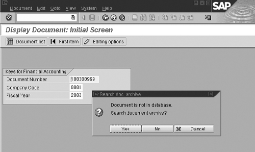 Besides the single document search strategies, you can set two other options for displaying archived FI documents. You can decide whether to have a pop-up query before the system accesses archived documents (Figure 3). You also can decide whether documents that have been archived before a currency changeover should be displayed in the old or the new currency. Such documents are always stored in the old currency in the archive files.