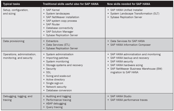 For a technical expert, the world is constantly changing in terms of basis knowledge and operational tasks required. The introduction of the appliance delivery models — SAP HANA being one of them — has been one of the recent disruptive changes in this area. The ability to integrate appliances into existing landscapes plays a significant role during system implementations. The tasks are not changing dramatically but the skills needed are different, always depending on the type of the appliance to be implemented. Table 1 highlights the key traditional and new skills for the different tasks related to the operations of SAP HANA.
