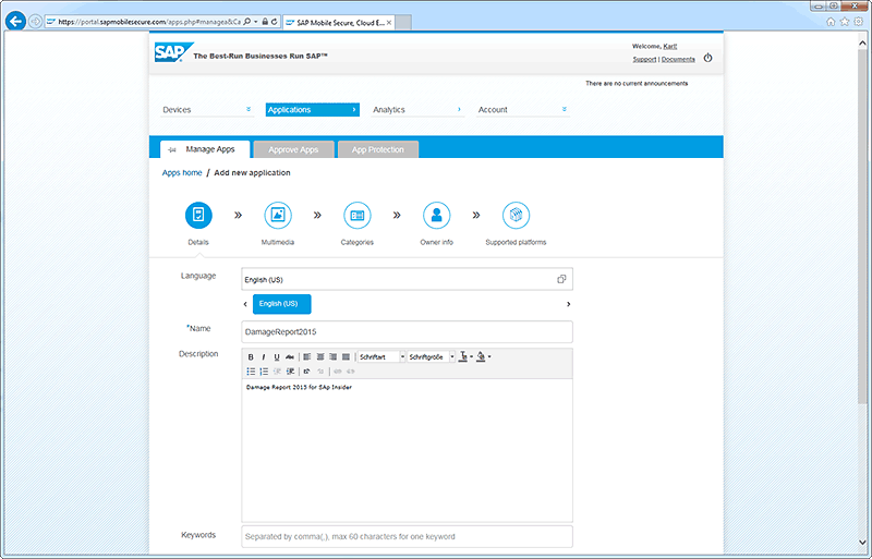 Figure 16), where you can manage your mobile apps and later publish them to Mobile Place. To wrap our example application as a mobile app, click on Add new application. Specify an application type (Fiori Application) and provide basic details for the app, such as a language, a name, a description, and any keywords (see