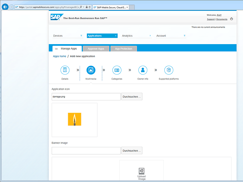 https://portal.sapmobilesecure.com/free_trial.php. After logging into the SAP Mobile Secure portal, go to the Applications console (see