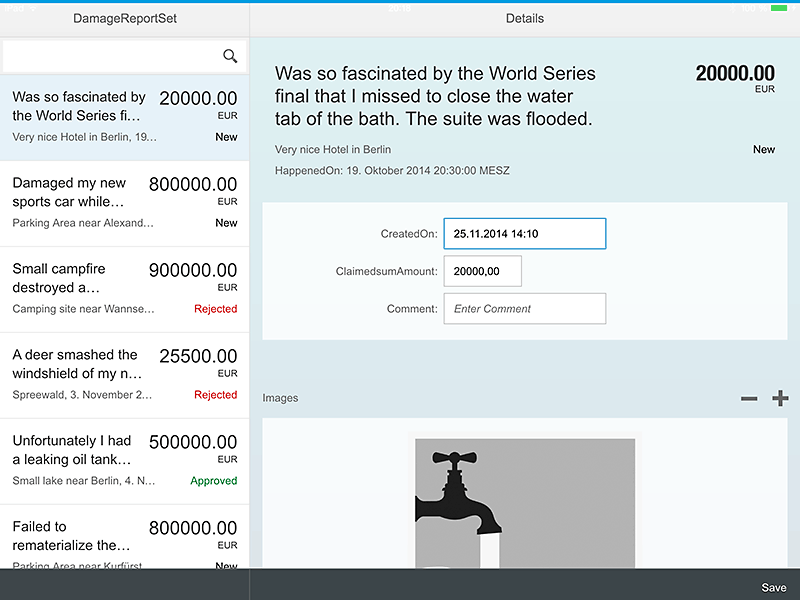 2 As you can see, it is a simple master/detail application for reviewing damage reports and managing claims, with a set of claims listed on the left and details for a selected claim displayed on the right, including a section for a diagram or photo and fields for comments, amounts, and approvals.