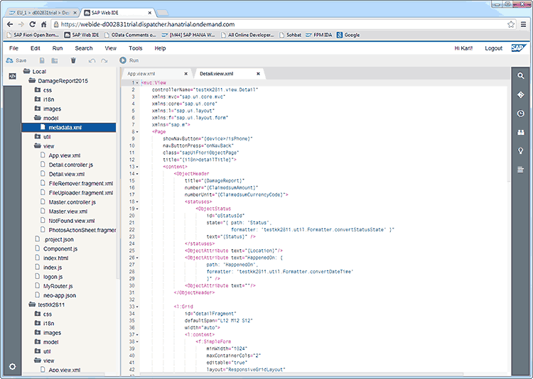 Figure 12) by right-clicking on detail.view.xml in the artifact tree and selecting Open With > Layout Editor. You can also run the application in preview mode by selecting the start page (index.html) in the artifact tree and clicking on Run in the menu bar. The resulting application (DamageReportSet) is then displayed in your browser with an item selected ready for claims review (see