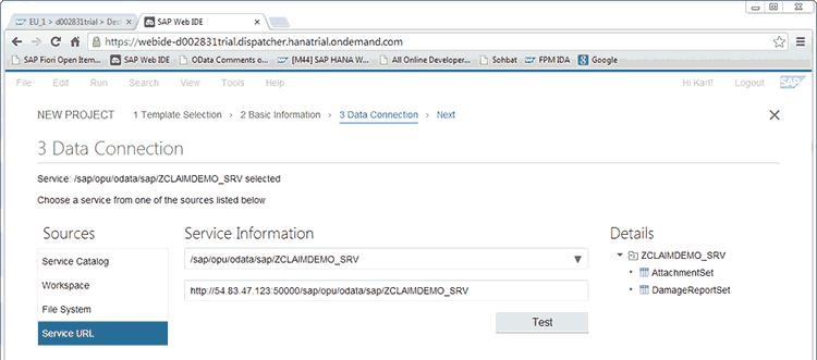 Figure 8), specify the data connection — for the example, the OData service we created previously under Destinations in the SAP HANA Cloud Platform cockpit. Under Sources, select Service URL and under Service Information, specify the system and URL we defined for the service earlier in the Destinations configuration. You can easily test the availability of the service and check its metadata, which is displayed under Details. The OData service ZCLAIMDEMO_SRV consists of the entityset DamageReportSet and an associated AttachmentSet (for attaching diagrams or photos describing the damages being claimed).