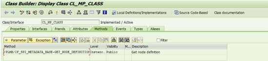 Create a normal OO class by calling transaction SE24. Add the interface /PLMB/IF_SPI_METADATA_BASE to the class by clicking the Interfaces tab. Implement the GET_NODE_DEFINITION method. Enter the value of the attribute PLMB/IF_SPI_METADATA_BASE~GV_VERSION. You can enter the value either as a default value or in the method GET_NODE_DEFINITION. You can select the value of GV_Version from class /PLMB/IF_MDP_C, which is shown in