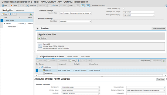 Figure 13 and add an initial page. Take the initial page as Form_Window as I have created a form on the first screen of the application. Enter these details: Component – FPM_FORM_UIBB; Config Id – Z_INITIAL_SCREEN; and Window Name – FORM_WINDOW. Click the Save button and then the Configure UIBB button, which takes you to