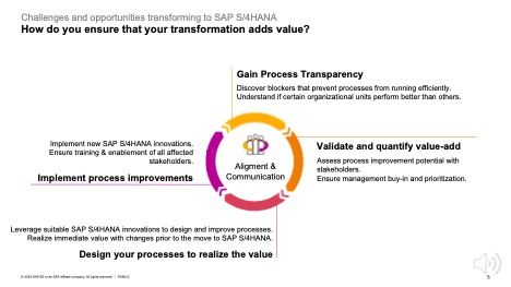 Companies still using SAP ECC and considering a move to SAP S/4HANA Cloud, or those already in transition, must ensure that the investment generates long-term value, and that the transformation is fast, and manageable. Anybusiness transformation significantly impacts an organization's value chain; therefore, it is crucial to take a consistent and continuous approach that integrates people, processes, and technology.