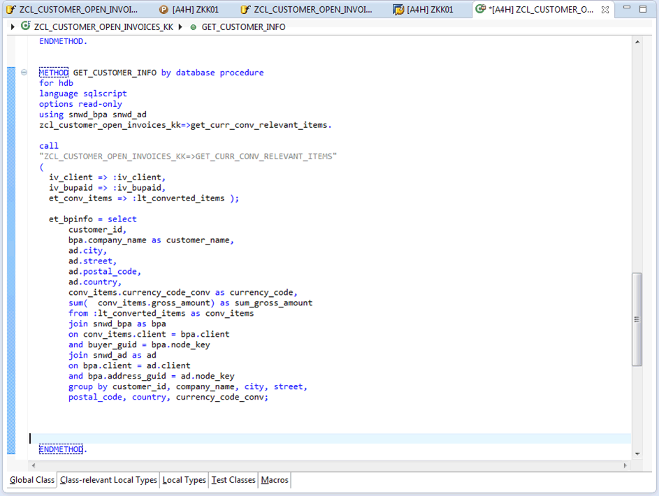 Figure 6 shows an example AMDP (ZCL_CUSTOMER_OPEN_INVOICES_KK) in the class editor of ABAP in Eclipse, based on the open invoice items example scenario. AMDPs are wrapped into regular global ABAP classes. A method that contains a stored procedure is introduced by the special keyword by database procedure for hdb language sqlscript, which indicates that other database platforms can hook in their particular programming languages for stored procedure development.