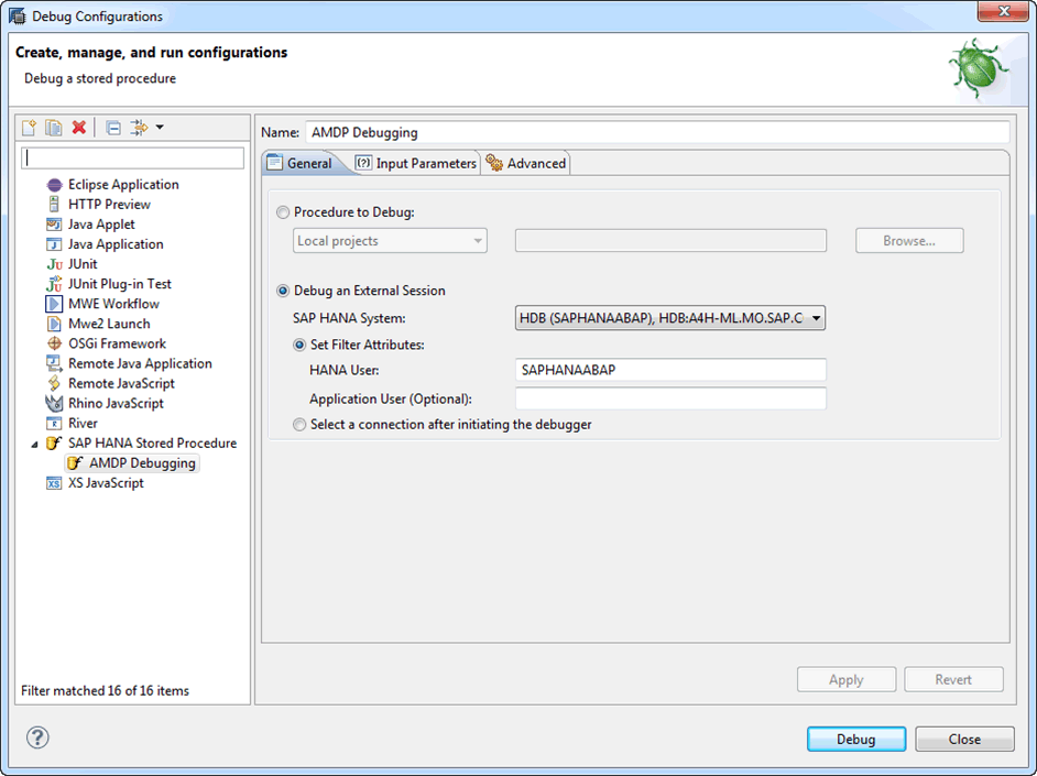 To start the SQLScript debugger, you need to maintain a debug configuration by pressing the debugger configuration icon in Eclipse, which launches the dialog shown in