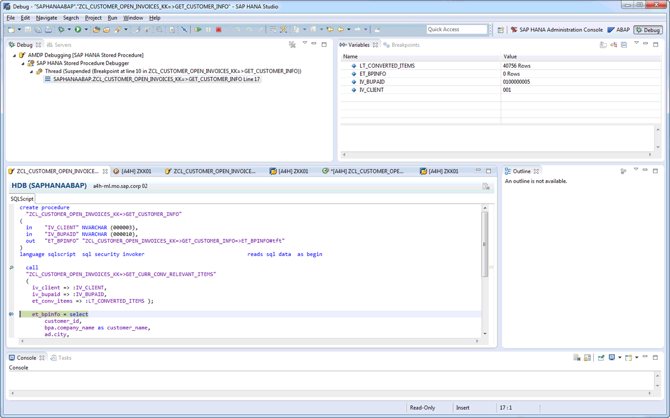 Since working with AMDPs is a rather low-level procedural approach, debugging support can be helpful. While breakpoint setting on the ABAP level is supported, it would invoke the ABAP debugger, which treats the SQLScript commands as an atomic execution unit, meaning that stepping into the procedure itself is not possible. Fortunately, you can easily set breakpoints in the source on the SAP HANA level by invoking the SQLScript debugger in the SAP HANA studio.