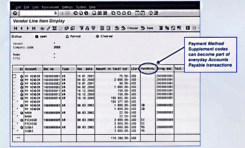 As shown in Figures 1 and 2, the Payment Method Supplement codes can become part of everyday Accounts Payable transactions such as Vendor Invoice Data Entry or Vendor Line Item Display in addition to their use during check printing. Since your primary question is on the latter, my "how to implement" steps in the next section focus on that.2