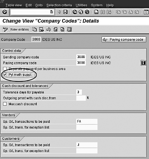From the Payment Program menu, follow the menu path Environment>Maintain Configuration (or from any main window in R/3, just use transaction code FBZP). Select the All Company Codes button, and then drill down on your company code. Put a checkmark in the Payment Method Supplement checkbox in the Control Data section to activate the functionality and then Save your work. An example is shown in Figure 3.