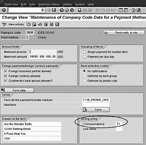 Toggle back to your other session of the main Payment Program Configuration Menu (transaction code FBZP). Drill down on the Pmnt Methods in Company Code button. Drill down on your company code and payment method, "C" for "check." In the Form Data section, in the box labeled Sorting of the..., enter your sort variant in the data entry field next to Correspondence. Save your work. An example is shown in Figure 6.