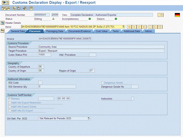 Figure 11 displays the placement details transferred from the SAP ECC logistics document, country of origin, country of departure, and if it is a sensitive part or dangerous goods, among other details.