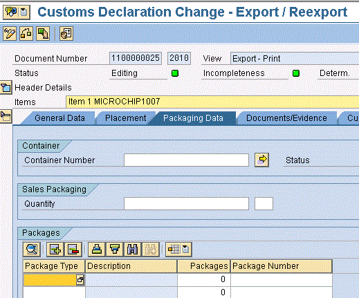 Within the customs declaration document you can click the Packaging Data tab and maintain the package type, number of packages, and container number for shipment transported (Figure 12).