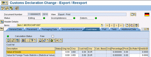 Figure 13 displays the customs value transferred from the feeder system with the customs value. The value of goods is transferred from the SAP ECC logistics document (i.e., pro forma). The net value is captured from the item value, and the foreign trade statistical value in the SAP BusinessObjects Global Trade Services customs document is captured from the SAP ECC pro forma document pricing condition GRWR. The statistical values are calculated based on the inco term and the GRWR condition value from the SAP ECC logistics document. If the customs value currency for reporting is different from the document currency, then you need to maintain the currency conversion in SAP BusinessObjects Global Trade Services.