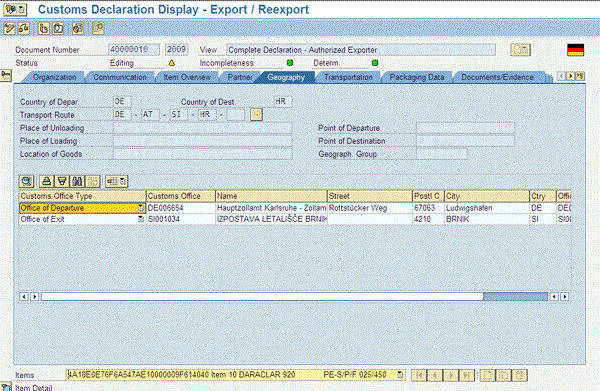 Figure 14 displays the header view of the Geography tab. The country of departure and destination are transferred from the SAP ECC pro forma document. You can set up the default data determination for the route based on the partners involved in the transaction. You can also set up the office of departure and office of exit as a default data determination. This information is transferred to the IDoc and the office of departure is used for EDI partner profile determination.