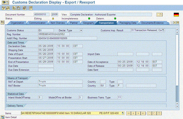 Some other important data elements in the SAP BusinessObjects Global Trade Services customs declaration document are the customs status and declaration type, which you can configure in the SAP BusinessObjects Global Trade Services configuration by default. The key dates, declaration date, shipping data, date of export and so on are transferred from the SAP ECC logistics document. You can transfer the mode of transport from the SAP ECC logistics document or have it defaulted within the SAP BusinessObjects Global Trade Services customs declaration document.