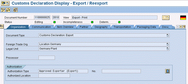 When you display the customs declaration document within the Organization tab, you can see the authorization defined determined. The system determined the appropriate license and transferred the information, including the document authorization type, authorization location, and the authorization number (e.g., DE5850ZA3827). This information is transferred from the authorization that was maintained earlier, as shown in Figure 17.