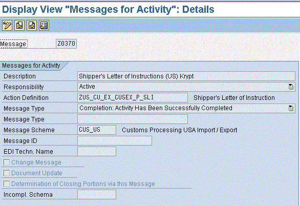 Figure 19 displays the configurations details for a message type used on the ATLAS online submission. The key definition details for message type M0940 are shown here. In the Responsibility, select Active. In the Action Definition, you have the pre-delivered definitions provided in the system for ATLAS submission – DE_CU_EX_EXAZ_M_EXPDAT. For the Message Type, enter /SAPSLL/CUS_EXP, for the Message Scheme enter E_EXP_SAT, for EDI Techn. Name enter DEXPCS, and for the Incompl. Schema enter DE_EXP_UV2.