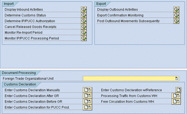 The first section provides transactions and functions for monitoring the customs declaration documents. Outbound activities allow you to capture the export declaration documents, based on the SAP ECC pro forma document. The Customs Declaration section allows you to display the customs declarations documents individually.