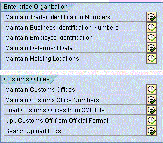 The foreign trade organization (FTO) is the legal entity that is responsible for the customs declarations. You assign the business identification number (BIN) to the FTO using the function Maintain Business Identification Numbers option in Figure 3. Similarly, you set up the TIN for legal units through Maintain Tax Identification Number in the Enterprise Organization section. The declarations are reported to the customs authorities and these are identified as customs offices. Customs offices are maintained within the section Customs Office and Maintain Customs Offices.