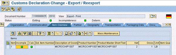 Figure 10 displays the item data populated within the customs document item from the SAP ECC pro forma document (e.g., the SAP ECC part number, material description, quantity, and weight).