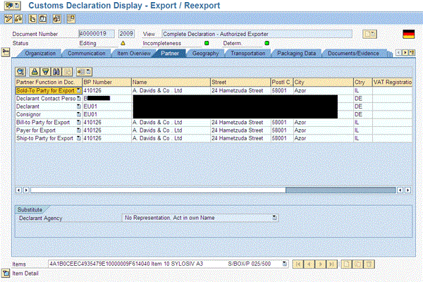 The partner details in the customs declarations are transferred from the SAP ECC logistics document (e.g., pro forma). The partner functions that are transferred from the SAP ECC documents are sold-to, bill-to, payer, and ship-to. Partners are necessary for making online declarations (e.g., the declarant and declarant contact person). You can default them based on partners transferred from the SAP ECC pro forma document set rules in the default data determination. You can set up the incompletion procedure to capture the partners required for declarations and use the default data determination to determine all the partners necessary to complete the document before submitting the document.