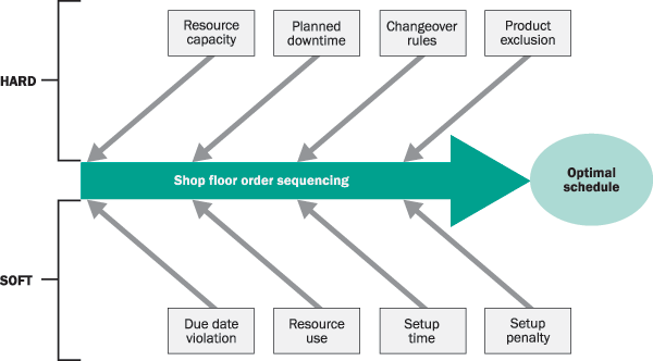 violated and require major shop floor changes to override, such as downtime and resource capacity. Soft constraints are