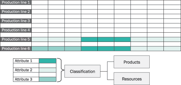 define the blocks on resources across time. Production lines 5 and 6 are blocked for the products that have attributes 1,