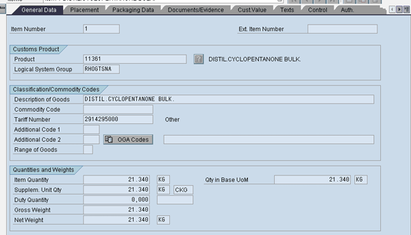 Following the review of the header data, let’s review some critical item data. In the default view of the customs declaration item overview, click the Documents/Evidence tab. So far you have been reviewing the header data, but you can click the Item data to view item-related information. The General Data view provides the overview of the item with the product number, description, tariff number (Harmonized Tariff Number), other governmental agency (OGA) codes, item quantities, and weight (Figure 11). Users should review this information prior to submitting it to customs because if it is incorrect, they will get an error message.