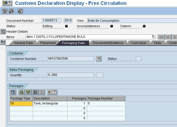 While in the item data General Data tab, click the Packaging Data tab. In this view, the packaging data is stored by type, displaying the container number. This is a critical piece of information that is transferred to customs for declaration purposes (Figure 12).