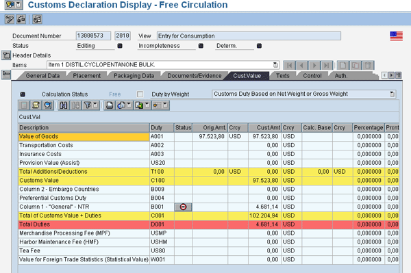In the same view, click the Cust.Value tab to view the customs values with duties details (Figure 13).